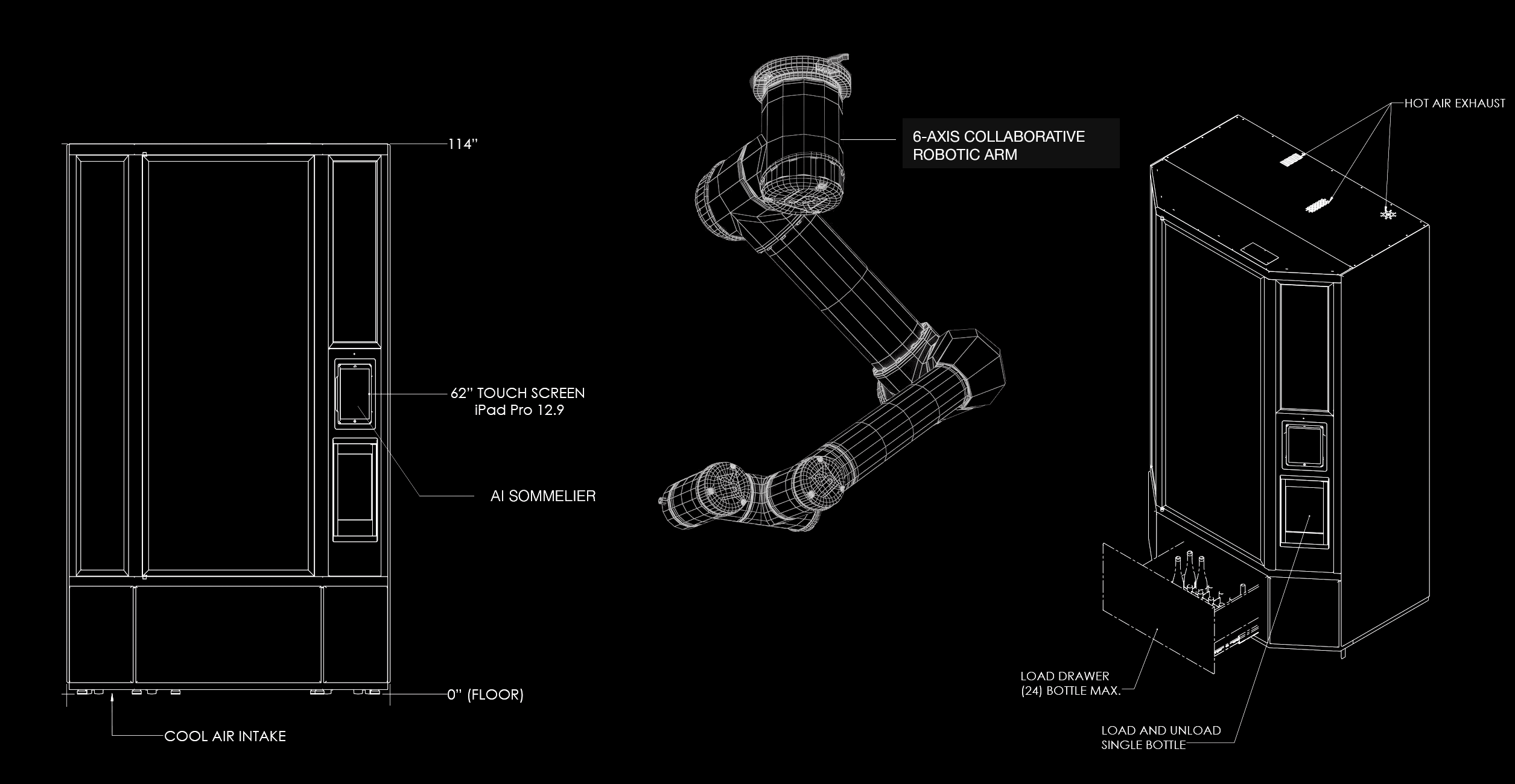 The first real robotic arm ever installed in a residential setting or a restaurant, wine bottles are stored in a temperature and humidity-controlled environment, accessible through highly secure facial recognition and via a customizable app.